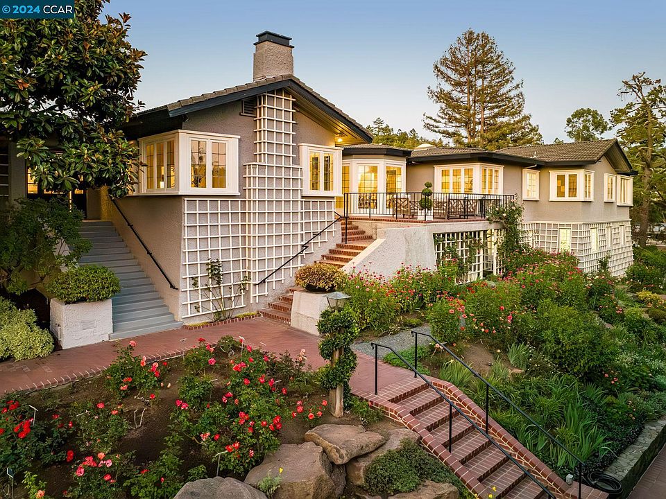 An impeccable rose and flower garden welcomes residents and guests to this gracious Piedmont estate. Built in 1909, the home was designed by noted architect Louis Christian Mullgardt, who also designed the DeYoung Museum in Golden Gate Park, the Court of the Ages at the 1915 Pan Pacific Exposition, and the home of the President of Stanford University. Enter from the garden and choose a room to entertain: the immense living room (with skylights and a distinctive fireplace), or the even-larger family room (with another fireplace). Adjourn to the dining room for a fine meal, or dine casually in the breakfast nook adjacent to the kitchen, with French doors leading to a secluded garden and deck. The kitchen features elite appliances, skylights, marble counters, and an island, all under a beamed ceiling. One relaxes or reads in the afternoon in the adjacent sun room. Four bedrooms are upstairs, including the 408-square-foot principal bedroom, and all bedrooms command views of the immaculate garden or surrounding redwoods. The home features 5,570 square feet of finished space, and the home’s lower level offers more: extensive unfinished space that can be built out to the owner’s desires.