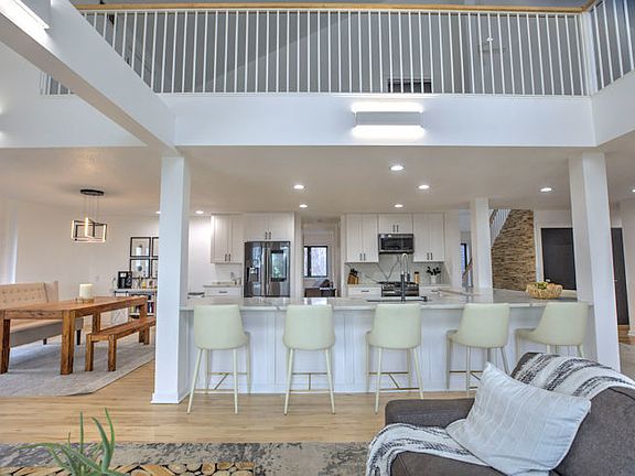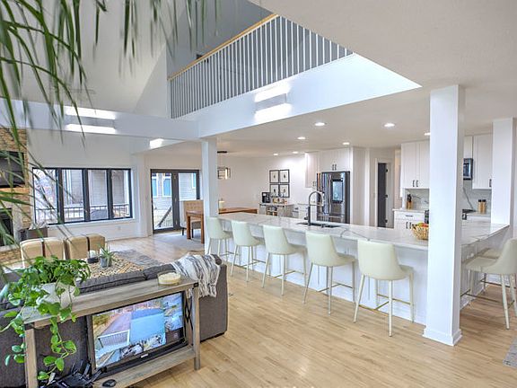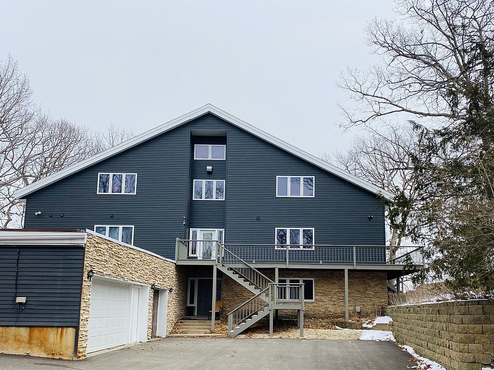 ** PRICE REDUCTION ** Modern Lakefront Retreat located in the gated Lost Nation community! This 3 level home boasts over 7000 finished square feet and an ELEVATOR to assist anyone navigating throughout the house. Perched upon a cliff overlooking Lost Lake with direct access and private dock on the property, the views are spectacular! Custom built, all steel construction home with an attached 4 car garage (49' x 29') that has been completely renovated in 2020. The great room has 23' ceilings with a stone fireplace. Floor to ceiling windows, 2 sets of patio doors, and maple hardwood floors in the entertaining areas that open out to the multi-tiered, wrap around deck. The kitchen is another amazing space. With a breakfast bar to host a large gathering, all new stainless steel appliances, and quartz countertops to complete the clean, modern feel. There are 6 bedrooms including a fabulous master retreat and two additional master suites on the top level with a massive lounging space to overlook the lake. Plus 5 1/2 baths... all with quartz countertops and ceramic floors. The spacious master bedroom retreat includes a 15 x 10 walk-in closet with built-ins. Plus a standalone bathtub with air jets, water jets, and LED lights. A separate walk-in shower and double vanities complete this glorious space. The lower level is a multi-purpose space that could function as a separate unit. It has a family room with pellet stove, exercise space, kitchenette, full bathroom, laundry, and 2 bedrooms. Also a brand new roof was just installed on the house this March 2022. Come watch the soaring Eagles from your own home. Relax on the multi-tiered Deck with built-in bar. Enjoy LAKE LIFE!