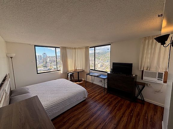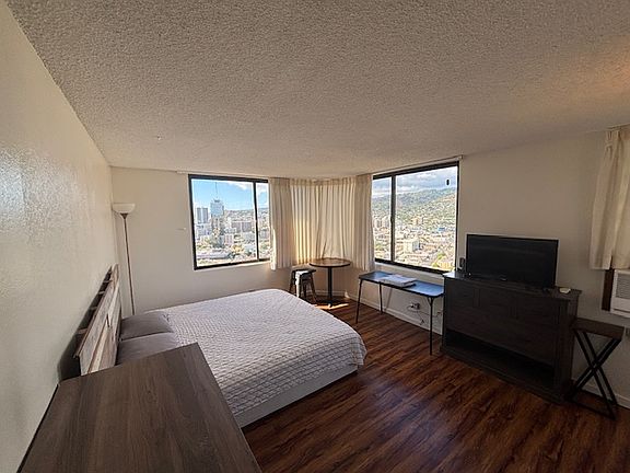 Furnished, high-floor studio with full kitchen available now. All utilities are included, furnishings include full sized bed, dresser drawers, small desk, TV. Hawaiian Monarch has 24/7 Security, large pool and deck area, community laundry, keyed elevator. Daily Parking available in the building for a separate fee ($45/day). Pub, restaurants, bakery and other commercial services available in the lobby. Numerous food trucks & 711 next door to property. Square footage is approximate. This is not a short term rental - minimum 6 months term. Sorry, no pets or smoking allowed in the unit. Minimum 6 month lease term. All utilities included with rent: electricity, water/sewer, wi-fi, roku tv.
