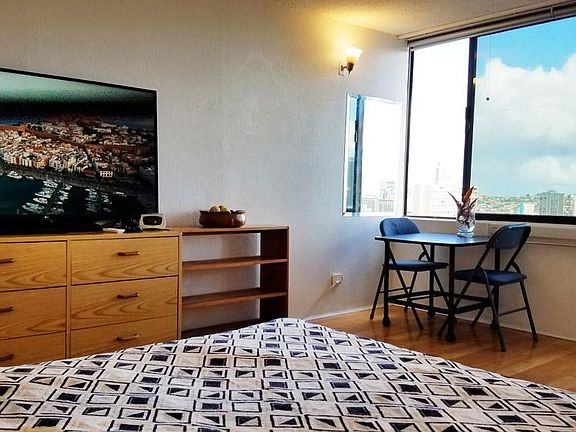 High rise Hawaiian Monarch hotel studio on top 25-th floor with magic view! $1,200 a month one year lease. $1,300 for 6 month. Recently renovated spacious clean furnished unit with a beautiful ocean and mountain views in a secure building with lots of great amenities. Few blocks from prime beach and right next to the peaceful Fort De Russy Park, Hawaii Convention Center, Ala Wai Golf Course, restaurants and public transportation. 25 min walk to UH campus. Great location! Apartment features: - High floor view of Waikiki. - Fully furnished. - Full kitchen. - ALL Utilities, Cable TV and Internet included. - Extra bed (Sleeper Sofa). - Full size fridge. - Hardwood floors. - Tiled bathroom and kitchen. - 55" Smart TV. - WASHING MACHINE in Unit! - Windows AC. - Ceiling fan. Amenities include: - Pool. - Patio/deck. - Workout room. - BBQ area. - Laundry. - Concierge. - On-site restaurant - 24h security with cameras and guards. - Hot tub. - Fitness room. All utilities are included - water, electricity, Internet, Cable TV. (Electricity is metered and paid by landlord up-to $100/mo. Any overage will need to be covered by the tenant) $1,200 a month one year lease. $1,300 for 6 month. - Security deposit is equal to one month rent. - Paid parking is available - $350 monthly for car, $50 for motorcycle, $20 for bicycle. - NO PETS - NO SMOKING - NO SUBLEASE This listing posted by the property owner, not a management company nor agency. No application fees, no credit check fees are required. To sign a lease please bring: - Check or cash for first month rent and security deposit. - Proof of employment and proof of earnings, copy of ID.