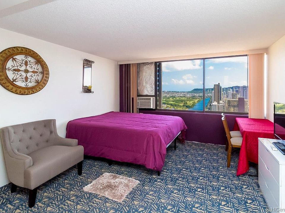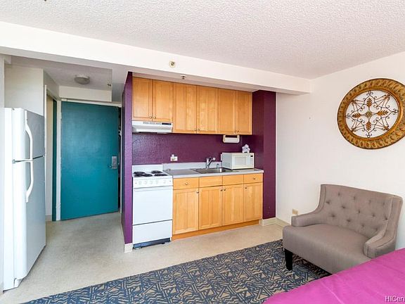 Furnished studio unit with full range/oven, full size refrigerator, sink, and kitchen cabinets. Queen size bed, window air conditioning, Includes electricity, internet, water/sewer. View of the Ala Wai canal, golf course, and mountains. Community laundry. No parking included with the unit, although parking may be available through the building's parking operator for a monthly fee. Amenities include a pool, hot tub. Long term (minimum 12 months lease). No smoking, no pets.