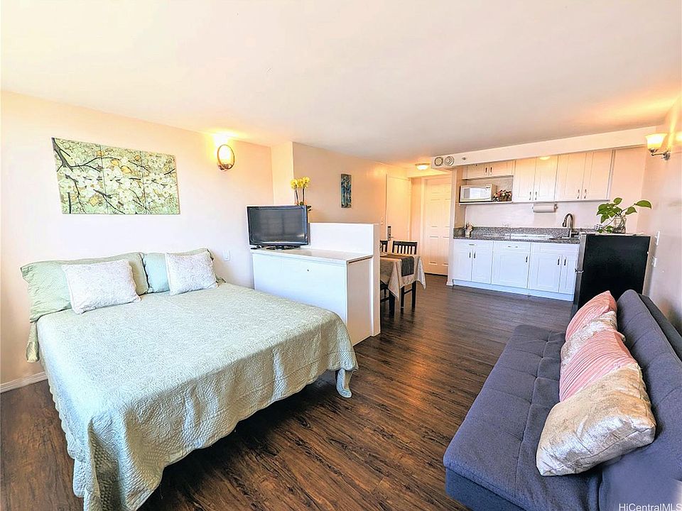 Fully furnished high floor 350 sq ft studio with a sofa bed convenience when you have a guest. Including all kitchen well, portable single burner electrical stove move in ready. Hawaiian Monarch amenities including 24/7 security, jacuzzi, pool and BBQ area, fitness center, community laundry area, key carded elevator and on-site convenience store and restaurant. Ideally located within walking distance to Waikiki Beach, shopping, dining, and entertainment. Rent $1800 includes water sewer, WIFI, Cable. Utilities and parking not included, but available for a nightly fee or through nearby monthly garages. No smoking and no pets.