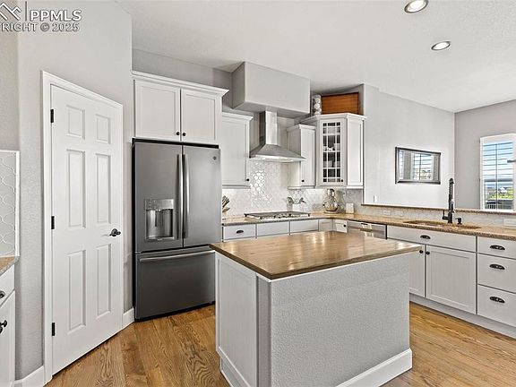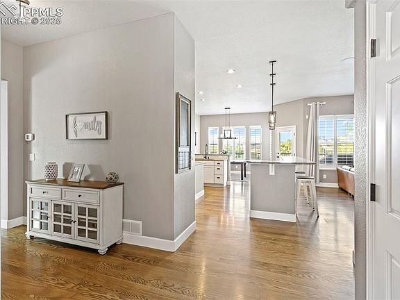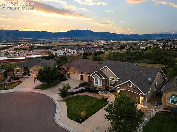 Beautifully maintained ranch style home in coveted Carriage Point West community of Jackson Creek. This gorgeous property is located on a quiet street backing to open space with stunning mountain views and offers the perfect blend of comfort, upgrades, and location. Just minutes from I-25 and zoned for School District 38. Inside, discover a thoughtfully designed & highly upgraded main level featuring rich hardwood floors, granite countertops, designer cabinetry, shutters, and a striking floor-to-ceiling stone fireplace. The open-concept layout connects the spacious living room, dining area, and gourmet kitchen, ideal for everyday living and entertaining. The chef’s kitchen is the heart of the home, boasting two large islands, separate breakfast bar, granite surfaces, wine fridge, and a walk-in pantry. The adjacent dining area flows seamlessly to a large composite deck for effortless indoor/outdoor living. The main level also offers a generous primary suite that includes a sitting area, walk-in closet, and a luxurious 5-piece bath completed with large soaking tub. Two additional main level bedrooms share a full bath. The mudroom off the garage features custom built-ins for convenient and organization. Downstairs, the finished walk-out basement expands your living space with a large family room with fireplace, direct access to a covered patio, three spacious bedrooms, all with walk-in closets and a full bath with double vanity. Enjoy Colorado’s beautiful weather from the upgraded composite deck, covered patio, and lawn, all with open space and Front Range views. Additional highlights include brand new roof, upgraded lighting, ceiling fans, whole-home CAT-5 wiring, and living room surround sound. This move-in ready home truly has it all with style, space, and a premium location.