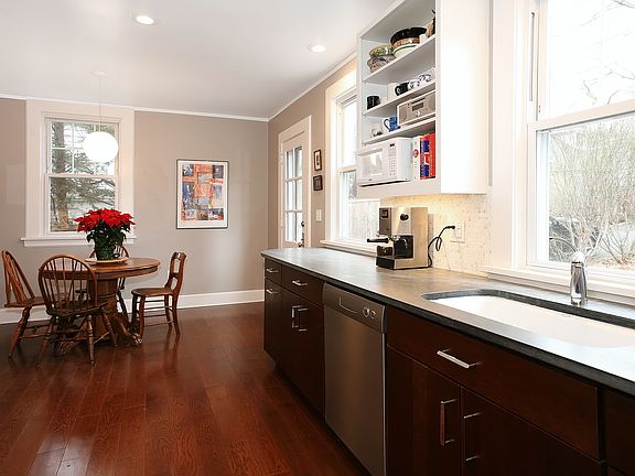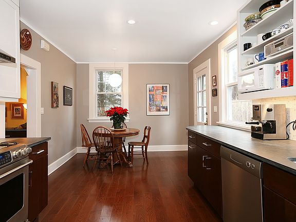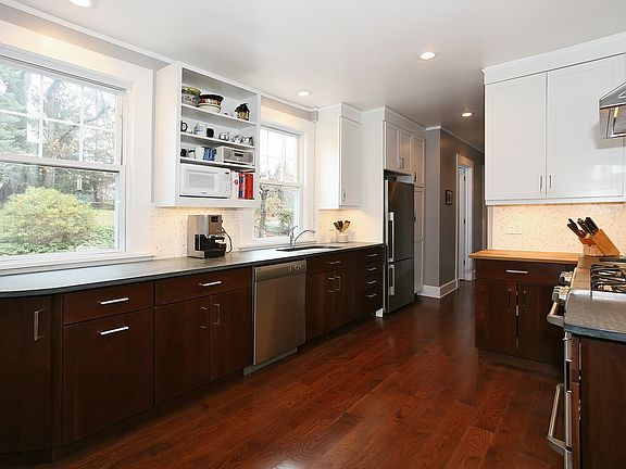 Upon entering this six bedroom, three and a half bath Pelham Federalist Colonial, you cannot help but be impressed by the beautiful hardwood floors and copious amounts of natural light streaming in through the floor-to-ceiling living room windows. It is wonderfully situated on a quiet street walking distance to train, shops and school. The formal entry hall is accented with an elegant staircase and French doors leading to the formal living room with a fireplace. The newly renovated dine in kitchen offers all the amenities: Pietra Carodoza counters, tile backsplash, stainless appliances, prep sink, a powder room, and a back staircase to the upper floors. The circular floor plan on main level has all spaces facing windows, offering outdoor light and view. The second floor has four well-sized bedrooms/closets, two full bathrooms and large built-in linen closet. The third floor has two more bedrooms with full bath and hallway landing that is the perfect reading nook. The property has garage, patio and mature trees and plantings offering privacy.