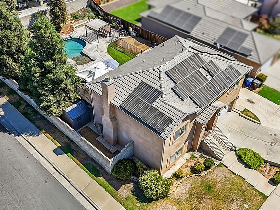 Welcome to this stunning two-story corner-lot home tucked away in a family-friendly cul-de-sac neighborhood! Step inside to a spacious living area with a warm gas fireplace, a convenient downstairs bedroom and bath, plus an indoor laundry room. Upstairs, the open great room is perfect for gatherings with an updated kitchen, breakfast bar, dining space, and a balcony overlooking your private backyard paradise. The master suite offers a large walk-in closet and a handy laundry chute, while two more bedrooms and baths provide plenty of space for everyone. Energy efficiency shines with a newer HVAC system (2 years old) and owned solar! Outdoors, enjoy resort-style living with covered RV parking and dump station, covered patio and balcony, pergola with gas firepit, a sparkling pebble-tech pool with rock waterfall, fruit trees, grass area, and storage shed. This home truly has it all-comfort, style, and endless entertainment!