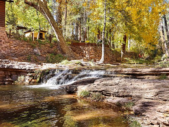 This spectacular creekfront log cabin Kohls Ranch near Christopher Creek offers a peaceful, natural escape from the everyday with a natural sound of moving water. It has 2 bedrooms, 3 baths, 1 car garage and 1980 livable sq. ft., open and spacious is the living room with laminate wood flooring and vaulted ceilings, plenty of light and windows with plantation shutters. If you like to cook or entertain you have easy access inside and out. Granite counter tops, kitchen island and an abundance of cabinet space, stainless steel appliances and a gas stove. The large primary bedroom also has access to the open deck, walk in closet and a full bathroom. The lower level that has access either by the lovely spiral staircase or by the walkway on the side of the home. It offers a potential 3rd bedroom, full bathroom and bedroom with a covered patio. Enjoy a walk to the creek through your private gated access or sit and relax with cool beverage. The front of the home has a quaint covered patio that is also a wonderful place to sit and enjoy the cool evenings. If you like apples there are plenty of apple trees in your front fenced yard. Nature, water and wildlife, is what you will enjoy along with serene living. Close to lakes, fishing and the Mogollon Rim are just a few added bonuses. The home is currently being used as an AirBnb and is frequently booked. Please schedule a time to see this amazing piece of heaven.