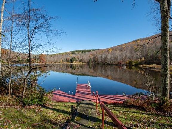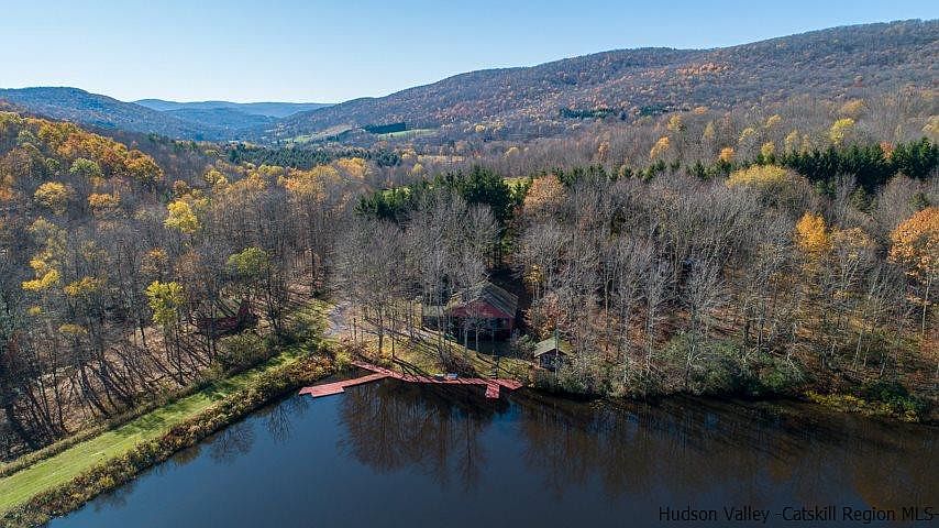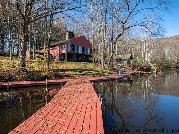 Sometimes reality far exceeds dreams, and this 5-bed, 3-bath lakeside home on 30 very private mountainside acres, with its own 10+ acre lake, is just that one-of-a-kind gem. A panorama of mountains surrounds this private crystalline lake which is over 25' deep. As close to the wilderness aesthetics of an Adirondack camp as can be imagined, but this is a Catskill Mountain retreat just 2.5 hours from NYC. ZILLOW HAS THE TAXES INCORRECT, THEY ARE ONLY ABOUT $572/MONTH. The custom contemporary home at the edge of the lake shore has five bedrooms and is well positioned for entertaining, or just a private family retreat. This property offers the ultimate in privacy inside of a protected forest wilderness just off of a quiet town road. Listen to the gurgling of the creek feeding the pure waters of this 17 acre lake and hear the wind brushing the branches of the forest all around. Resting beside a 10 acre over 25 foot deep pristine mountain lake, this field and forested property is surrounded by mountains. Included is an elaborate rambling dock system that extends into the lake allowing unprecedented access to the water for family and guests for easy swimming and boating , or just sitting at the shore. This contemporary home benefits from a well thought out open floor plan, highlighted by a massive blue-stone fireplace, flowing seamless into the dining and kitchen areas. The massive wooden roof beams support both the vaulted ceiling of the second floor and frame the first floor ceiling. Wood paneling throughout the house is of mahogany and the ceilings are tongue and groove knotty pine. There are three hearths - in the living room, family great room, and outdoors for a BBQ grill. The outside barbecue area is a covered patio and a nearby separate screened gazebo offers additional room to congregate and enjoy this magnificent setting. The first level, with a new wood surface composite floor, includes a bedroom and full bath and is accented by beautiful beamed wooden ceilings. There is a private game room for less formal visits. These spaces allow for easy access to the dining and living room, game room and barbecue area, making this a perfect venue to entertain both inside and out. The second level living room area features a spacious great room. Highlighted with full height massive fireplace of hand cut blue-stone, it reaches to the peak of the heavy beams of the cathedral ceiling. The second level is carpeted throughout and has the master bedroom with private bath, and 2 additional bedrooms, serviced by another full bathroom. The large sunroom at the second level, is almost completely windows for wide open views of the lake and mountains behind, where you can sit and enjoy the lake and mountain vistas. For the amusement of those younger, on the third floor is a loft bedroom. Located only 2.5 hours from the George Washington Bridge and all that the quaint mountain village of Andes and the Catskill Mountains have to offer, this once in a lifetime property is now ready and available for it’s next perceptive owner to enjoy.