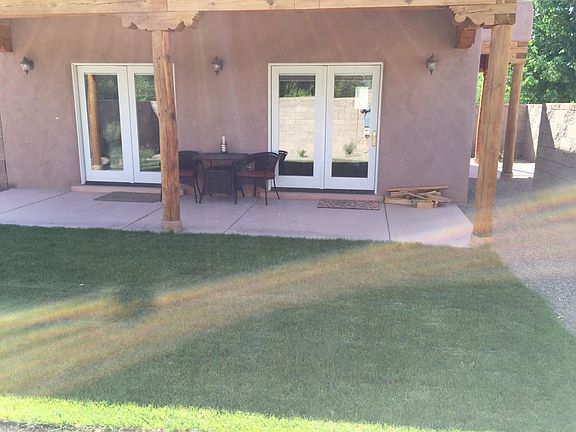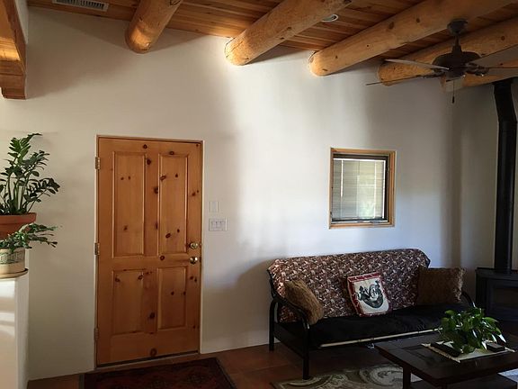 Beautiful guest house in Corrales with lots of privacy, custom designed with southwest features. Refrigerated a/c, large carport with storage, washer dryer, plus refrigerator, stove and dishwasher. There's a beautiful tiled shower, dining area, and wood beamed ceiling with free standing wood burning fireplace in living room and built in shelves.. .It is our casita on the property but very private. The unit is very bright with outstanding mountain views. It is a one block walk to our forested river Bosque with miles of biking, walking and horse riding trails. Horse facilities available close by .There is an area up to 1/4 acre for a garden. References required. The tenant pays Electricity and gas. The water,trash pickup and sewer are paid by landlord. One year lease required.