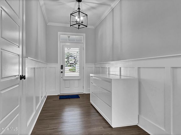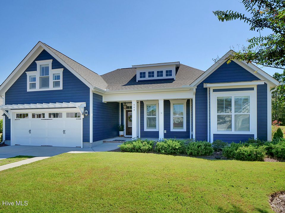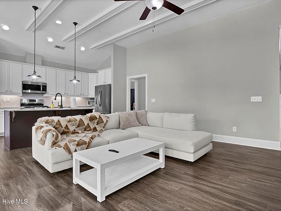 Welcome Home! This stunning home, located in the highly sought-after River Oaks Community, shows like a model & offers both luxury & convenience. Ideally situated near shopping, restaurants, Monkey Junction, & Carolina Beach ,you'll never run out of things to do. As you step into the wide, inviting foyer, you'll immediately notice the light-filled, airy atmosphere of your new home. The open-concept floor plan features a spacious living room with built-in shelves, a cozy gas log fireplace, & an 8-foot sliding glass door that opens to a beautiful screened porch overlooking a meticulously landscaped backyard. The living area flows seamlessly into the upgraded kitchen ,which boasts white ceiling beams, granite countertops, tile backsplash, pull-out drawers, a farmhouse sink set in a counter-height island, & stainless steel appliances, including a natural gas stove/oven, over-the-range microwave, & French door refrigerator are all included. Adjacent to the kitchen is a formal dining room, complete with tray ceiling, judges panels, & plenty of windows that allow natural light to pour in. The main level features three bedrooms & two full baths, with a split-bedroom layout for enhanced privacy. The Master Suite includes a tray ceiling, walk-in closet, & a luxurious en suite bath featuring a double vanity, walk-in tile shower, corner soaking tub, & a linen closet. The laundry room is conveniently located nearby & yes, the washer and dryer stay. Additional highlights include: