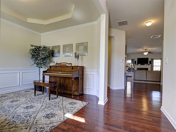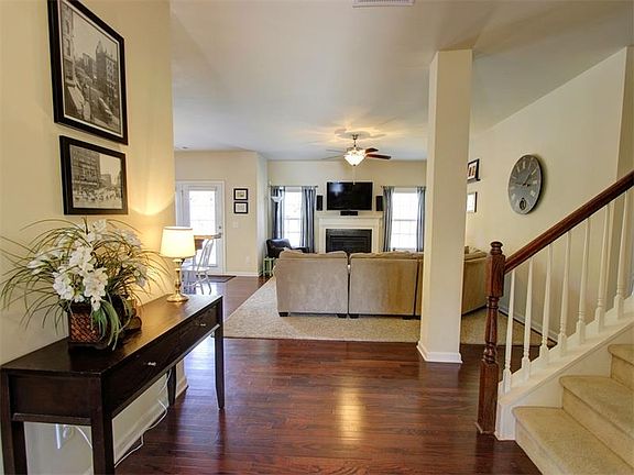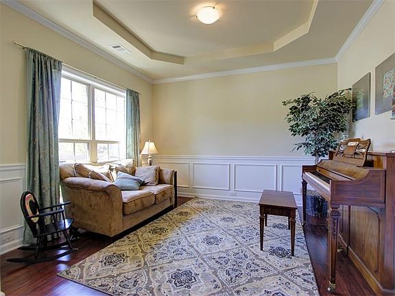 BACK ON MARKET!! Meticulously maintained 5 BR/3 BA home in sought after Evans Farms! Front porch leads to open floorplan w/ hdwds & 10' ceilings. Formal DR/piano room w/trey ceiling & wainscoting. Spacious kit w/granite counters & breakfast bar overlooks expansive FM w/gas fireplace & eat-in kit. 5th BR on main, great as flex space for BR/office/playroom/etc. Level, Larger backyard w/retaining wall, ideal for playing or parties. 4 Bedrooms upstairs, Master w/sit. area & trey ceilings & 3 additional BRs w/extra closet space. Garage has added storage space.