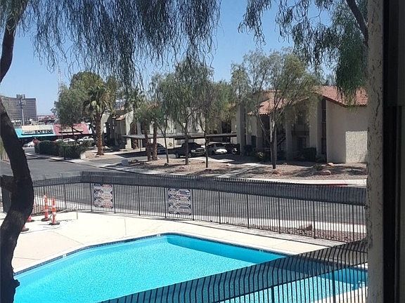 2 Bedroom, 2 Bath Condo, Primary bedroom ensuite. 3 blocks from the Palms Casino, 2 blocks from the heart of Chinatown, easy freeway access and less than a mile from the center of Las Vegas Blvd. This unit is directly above the community pool. Views from the porch of several strip casinos including Wynn, Caesars, Palms, Strat and the Link Wheel, front porch seating with views of Las Vegas Blvd. and back covered patio with mountain views. 2nd story, private unit access. Close to shopping, grocery stores and schools. Recent new roof, private repaved streets 2024 and beautiful landscaping. Beautiful nighttime views with lighting from the pool as well as the Las Vegas Strip. Roving security day and night. Property is surrounded by gates. Unit is currently Tenant occupied on a month-to-month lease. All appliances to stay, including in unit washer / dryer. One assigned carport space and guest parking.