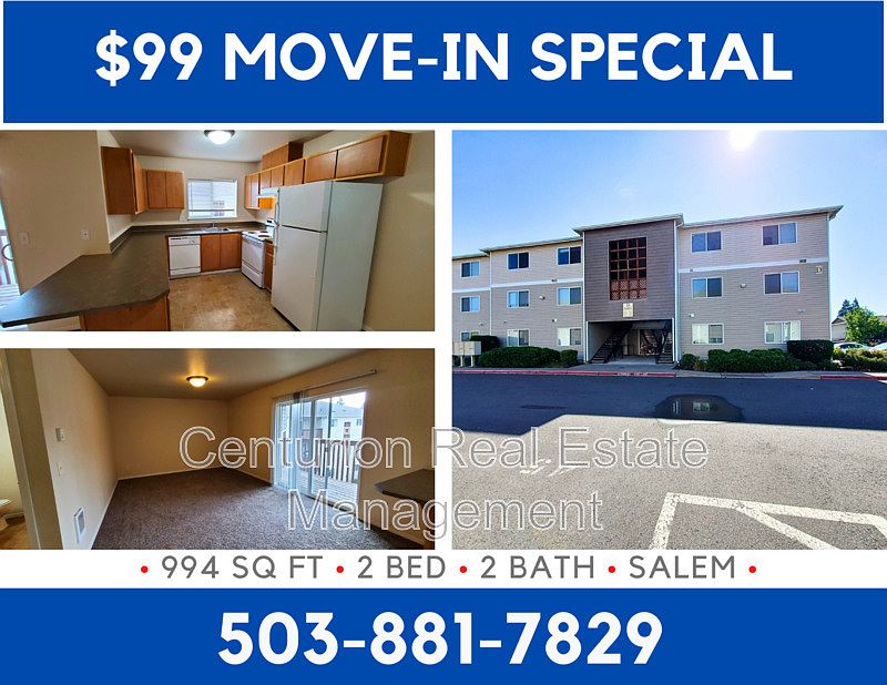 MUST READ MUST READ All Centurion Real Estate Management, LLC residents are enrolled in the Resident Benefits Package (RBP) for $50/month which includes renters insurance, HVAC air filter delivery (for applicable properties), credit building to help boost your credit score with timely rent payments, $1M Identity Protection, move-in concierge service making utility connection and home service setup a breeze during your move-in, our best-in-class resident rewards program, and much more! More details upon application. 1. Move-in Special ONLY applies to the current month. 2. The application process normally takes 1-3 business days. 3. Must see the property physically before the deposit is made. 4. If you have a pet, ESA or you don't have a pet you must register at https crem.petscreening.com 5. Apply to one property at a time. Address: 4440 Seaton Lane NE #C301 Salem, OR 97305-3970 Property Type: Apartment Rent: $1,395/MO Deposit: $1,200.00 (On Approved Credit) Application Fee: $68/ per adult 18+ Tenancy: 1 Year Lease Bedrooms: 2 Bathrooms: 2 Sq. Ft: 994 Stories: Single Owner Paid Utilities: Water/Sewer/Garbage Tenant Paid Utilities: Tenant is Responsible for Electric, Gas (If Applicable), And all Other Utilities Pet Policy: Pets are subject to approval and will require: Additional deposit of $400/ pet, Pet rent may vary depending on Paw Score, Starting at $45 up to $100 per pet, 2 pets max 25lbs Ready Date (tentative): AVAILABLE NOW! Viewing Status: SCHEDULE SELF-VIEWING TODAY! Amenities Included: Fridge Stove/Oven Dishwasher Heat Type: Electric Floor of Unit: 3rd Floor Laundry: Washer & Dryer In Unit Parking: Off-Street Parking Landscaping: Owner Responsibility Pet Policy: Notice to all residents and applicants, everyone must complete the screening process. This is not only for pet and animal owners; it applies to residents and applicants who do not own pets. The pet policy includes caged animals and pets. Additional deposits and monthly pet rents will vary; keep in mind that it is subject to the approval of your petscreening.com profile. You will not be moved into the unit without this completed. Prices are subject to change, we do not guarantee prices, items change, and errors occur. If there is a discrepancy between a price online and a price in the office, supervising property manager shall have the final say. *Due to overwhelming demand we may be unable to respond to your rental inquiry. INTERESTED IN THIS PROPERTY? Properties are on a self-showing lockbox and each listing specifies how it is viewed. Feel free to drive by the property to check it out. "This information is deemed reliable, but not guaranteed." Centurion Real Estate Management, LLC 1365 Commercial St. SE Salem OR 97302