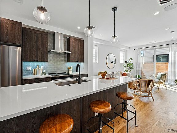 Welcome to this stunning end-unit townhouse in the vibrant and dynamic Berkeley neighborhood. With a perfect blend of luxury and functionality, this home has so much to offer. Whether coming from the street side or your deeded covered parking space, the location of the entry feels private and tucked away. The main level has wood floors and provides open concept living with a well appointed kitchen flowing effortlessly into the living room. On pleasant days, open the back sliding door to the private, fenced patio inviting in fresh air and sunlight. The patio is perfect for outdoor living, complete with a natural gas hook-up for a grill and space for a table. For added convenience, a powder room is also located on the main floor. Upstairs, find the primary suite featuring a large walk-in closet and a private en-suite bathroom. Just down the hall, the laundry closet offers convenience, while a versatile flex space awaits—perfect for a home office or exercise area. The third level boasts the second bedroom with its own en-suite bathroom and walk-in closet, another flex space, and the true highlight of this home: the rooftop deck. Partially covered and complete with a natural gas firepit, it creates a cozy, tranquil retreat—perfect for relaxing and unwinding. The home’s large, operable windows allow natural light to flood the rooms, and custom blinds add the perfect touch of style and privacy. An energy-efficient tankless water heater ensures you'll enjoy comfort and efficiency throughout the year. Living in this vibrant neighborhood means you're just moments away from some of Denver's top-rated restaurants, unique shops, entertainment, and businesses. Enjoy access to nearby parks, perfect for outdoor recreation. Additionally, experience the excitement of First Fridays on Tennyson and the lively Tennyson Street Fairs—an unbeatable way to connect with the local community. Or, explore further from home with quick and easy access to downtown Denver, I-70, and I-25.