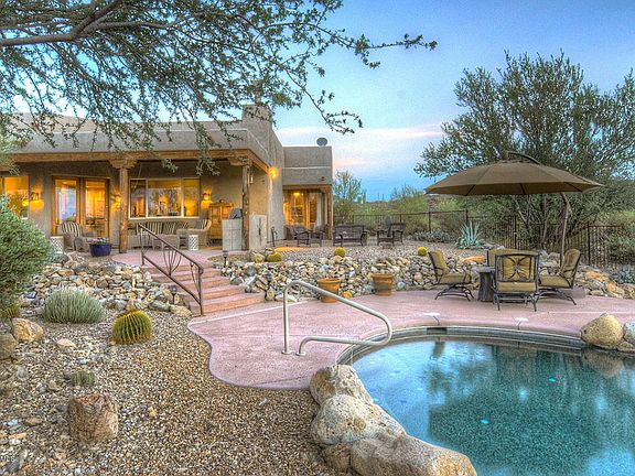 Amazing Custom Hm that looks and feels like a new model home! All windows feature Mountain views or City lights overlooking the pebble tech pool area! Travertine floors, accents, 2 fireplaces, Soaring high ceilings. Gourmet kitchen w/solid Granite countertops, ton's of cabinets and counterspace, plus banks of drawers, walk-in pantry and All Stainless Appliances! Covered back patio with outdoor ''kitchen'' overlook the pool area to City Lights. Split bedroom plan w/one guest rm enjoying own access to the pool area. Guests full bath also has a jacuzzi! Oversized Garage, Horses, RV are OK. All paved roads only 4.5 +/- miles west of 1-10 near Saguaro National Park. Great riding and hiking possibilities. Home also available on 7 + acres (2 lots with city water) for $599,900, GREAT Value