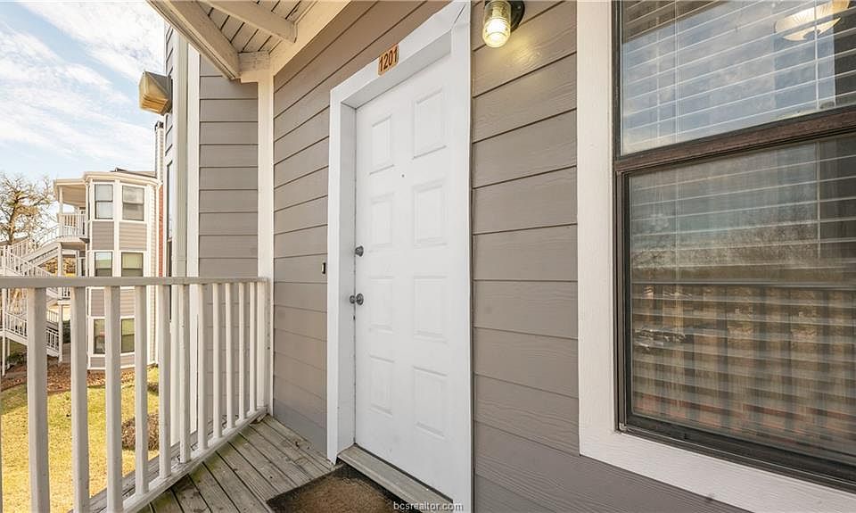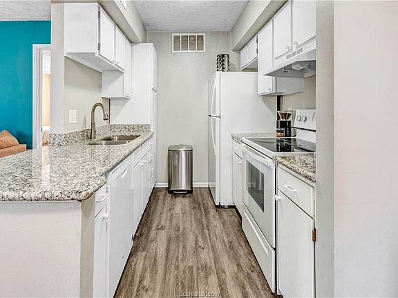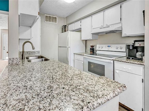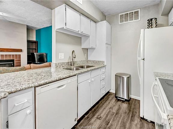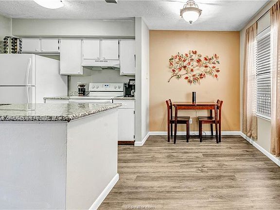 You've just run out of reasons to rent! Close to Texas A&M and on the bus route, this 1 bedroom/1 bath unit won't last long. The living room features solid surface flooring, a wood burning fireplace with mantle and a cozy bay window overlooking the front of the complex. Just off the living room is a quaint dining area and kitchen with granite counters, white cabinets and appliances, electric range, a pantry and refrigerator. The spacious bedroom has a large walk-in closet, a second bay window and a door leading to a covered patio overlooking the complex green space and pavilion. With a recent remodel, the bathroom includes the washer and dryer, porcelain tile flooring, resurfaced tub and shower, real wood cabinet doors, newer fixtures and light kit. The HVAC was replaced in 2020 and the washer, dryer and refrigerator are included. HOA dues include water, trash, and sewer and they recently replaced the exterior siding as well as installing new gutters. Call for your private tour today!