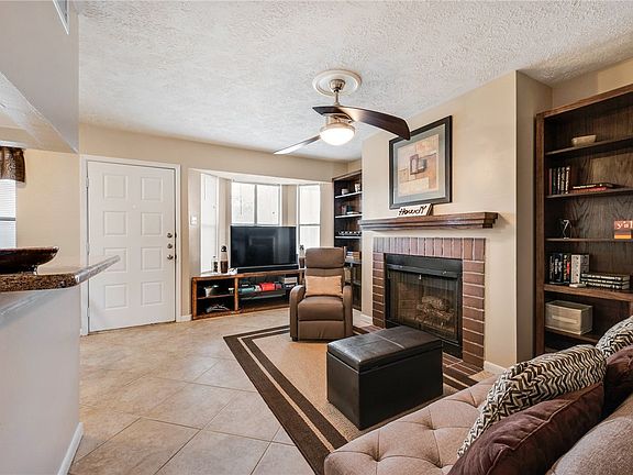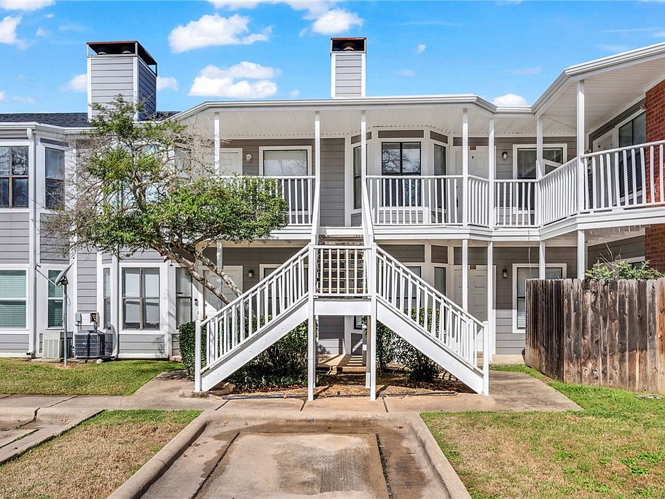 Located one mile down beautiful quaint lighted College Main to Texas A&M University and on the bus route. This 1 bedroom 1 bathroom upstairs unit has a front door covered landing. The living, dining and bathroom features solid tile flooring, a wood burning fireplace with custom oak mantle with cozy bay windows located in the back of the complex. The living room fashions a custom built oak entertainment center made for the bay window which makes the living space very efficient. Just off the living room and kitchen is a quaint dining area. The kitchen and bathrooms have real wood white painted cabinets with granite countertops. The spacious bedroom and large walk-in closet is carpeted, a second bay window contains a built-to-space desk which provides for a very efficient office area. A back door leads to a covered balcony overlooking the complex green space and pavilion. Custom closet shelving makes for efficient and strong storage options. Additional beautiful custom furniture to include oak bookshelves, nightstands, printer stand are negotiable as well as dining table and chairs, cozy queen bed, single sleeper futon settee, futon sleeper couch, recliner chair, storage bench, area rug TV, ottoman and designer style glass and painted wall hangings are negotiable for your turn-key move in. HOA dues are low and include exterior maintenance. Call for your private tour today!