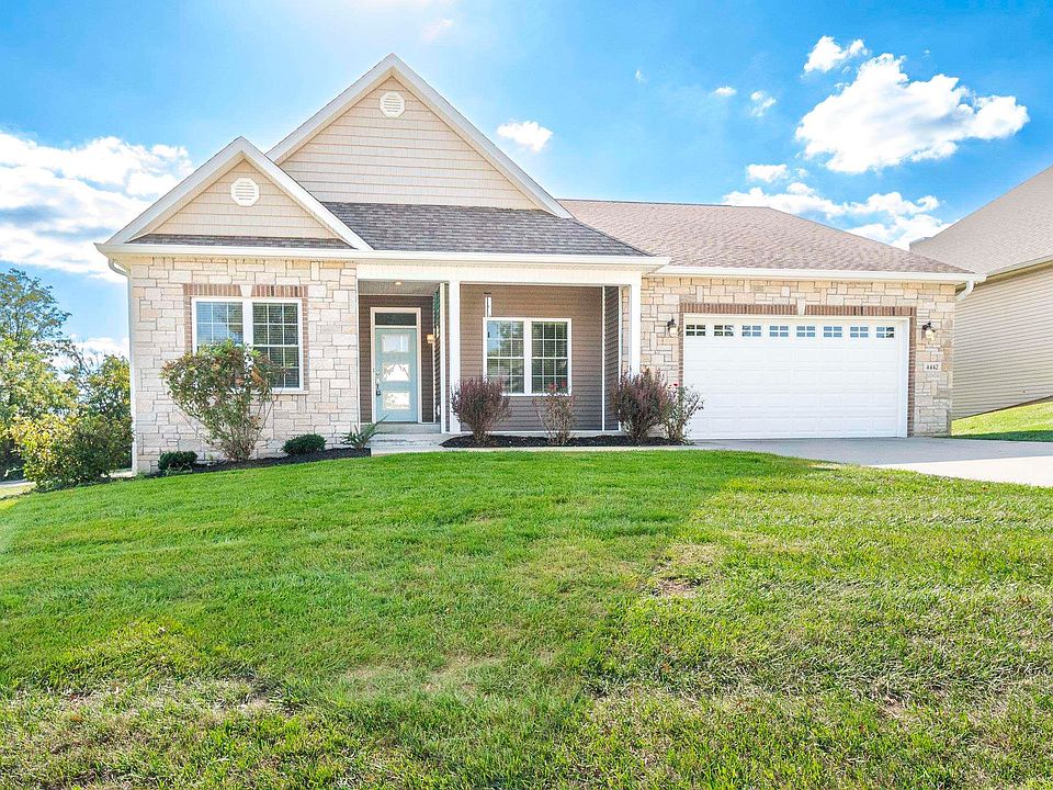 This 2016 ranch-style home, featuring a walk-out lower level, is located on a quiet cul-de-sac in Sutton Place on the south side of Bloomington. The main level offers an open-concept kitchen and great room with vaulted ceilings, ideal for gatherings. It includes three bedrooms and two full bathrooms. Most of the main level features Italian porcelain tile flooring. The well-equipped kitchen features Amish-crafted cabinets, granite countertops, stainless steel appliances and a breakfast bar. The lower level provides additional living space with a full bath, large recreation room, a wet bar, and a media room. Outside, there's a spacious deck on the main level and a patio below, both overlooking a large backyard.