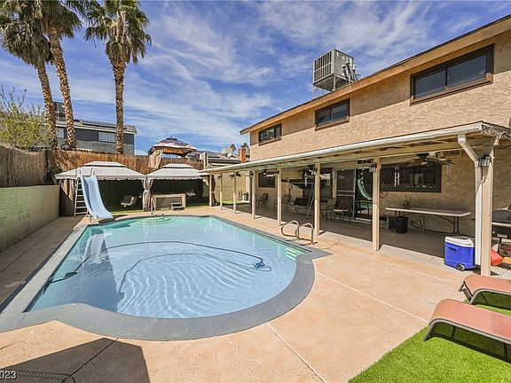 An Elegant blend of Modern Style and a Classic Las Vegas Feel. This tasteful two story POOL home has RV parking, NO HOA and is just minutes from shopping, schools, freeways, restaurants and The STRIP!! Your dream kitchen has plenty of cabinet space and includes stainless steel appliances. Premium vinyl flooring extends throughout main areas with carpet in the bedrooms. Enjoy the outdoors with your large covered patio with ceiling fans, your sparkling blue pool and beautiful hot tub with canopies to keep you cool during the summer nights. Slide down the slide!! Low maintenance desert landscape leaves your days for relaxing! Schedule your private tour today
