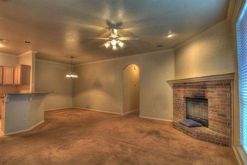 BRAND NEW CARPET Stress and maintenance free living, gated community patio home, community pool, lawn maintenance, sprinkler system, living room with fireplace and ceiling fan, open kitchen floor plan, pantry, spacious utility room, study or bedroom with closet, master bedroom with large walk in closet and bathroom with separate jetted tub and shower, double vanities.