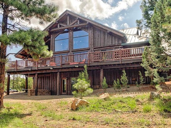 Beyond Stunning!!! Gorgeous Log Retreat on 5 acres under the tall pines in the Happy Jack Mountains. Spacious 4 bedroom, 4 bath in an open floor plan with wood galore! Tall vaulted T&G ceilings and majestic wood beams, hovering over the magnificent custom stone wood Fireplace in Great Room. Hickory hardwood floors and full wood trim package wraps around the windows and doors. The sunshine billows through the exceptionally large windows throughout. The spacious kitchen has custom crafted cabinets, granite countertops, stainless steel appliances, including GE Profile Refrigerator, and a gas range. The Grand Master Suite, with custom stone gas fireplace, has it's own upscale Kohler Steam Shower, double sinks, jacuzzi tub, and walk in closet. All guest bedrooms include separate gas stoves.