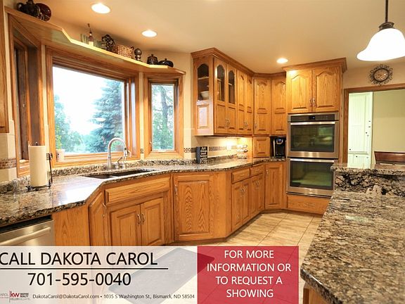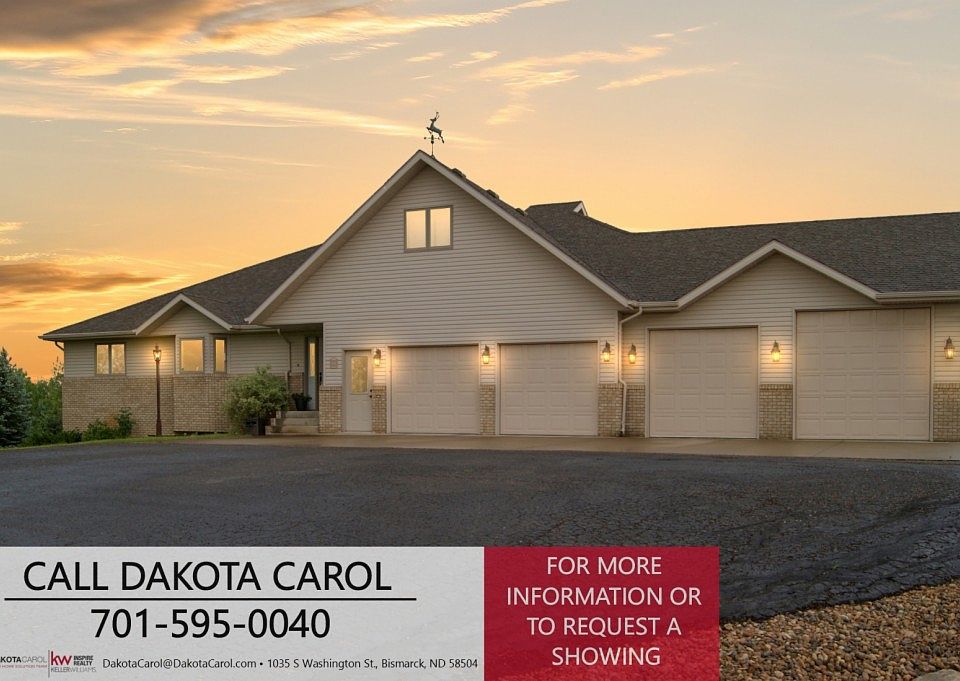 Need space, privacy and convenience? This home has it all - abundant square footage, a private rural setting and is minutes from downtown Bismarck! This property includes an additional lot thatll give you 4.11 acres total to enjoy! In the heart of this beautiful home youll find a dining room, that is next to the open kitchen that includes a walk-in pantry with wall-to-wall cabinets. On the main level, there are two master suites with full baths and walk-in closets, a bedroom, full bath, office, laundry room, living room and a sunroom overlooking the back yard. The upper level loft holds a private bedroom. The walkout basement is equipped with an enclosed hot tub room, 2 bedrooms, 3/4 bath, movie theatre room, and a family room with a kitchenette. There is also a hobby room with cabinets, an island and a sink. The 4 stall garage is heated by heated floors. The exterior of this home features steel siding, and a heated cement driveway. Dont wait! See this amazing property today!