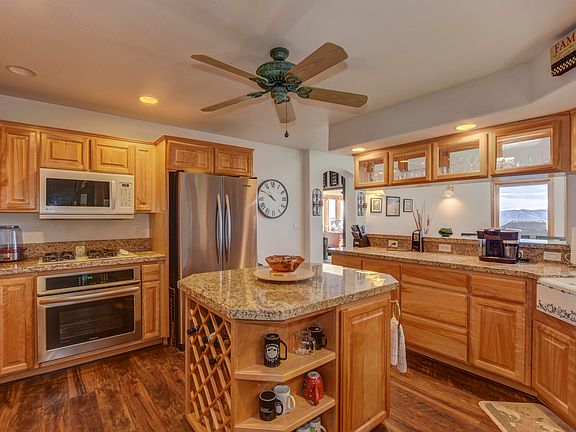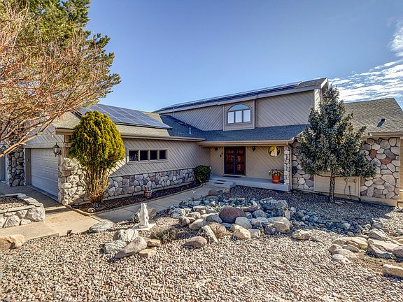 BEST VIEWS in Yavapai Hills. Day or Night truly a must see!Master bedroom on the main level. Great home for many purposes. Downstairs fully equipped with kitchenette, that's right 2 kitchens in this house. Wood pergo flooring on top, granite kitchen counter tops.. The upper level has a private sitting area, 1 bedroom and full bath for your guests to enjoy some privacy. The downstairs has a perfect setup for a MOTHER-IN-LAWS quarters or VACATION RENTAL, WITH A PRIVATE ENTRANCE.( Kitchenette, full bath, 1 bedroom, bonus room/office, large living room, private deck and access to the greenhouse). NEW ROOF in May 2018. NEW LEASED SOLAR SYSTEM. TRANSFERABLE TO NEW OWNER. Seller cut her bill to a 1/3!!!