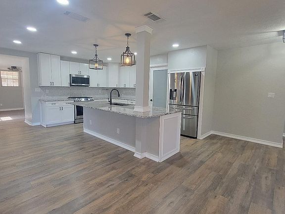 Open floor planStainless steel appliancesStorage buildingGranite countertopsCovered patioBreakfast barPrivacy-fenced backyard