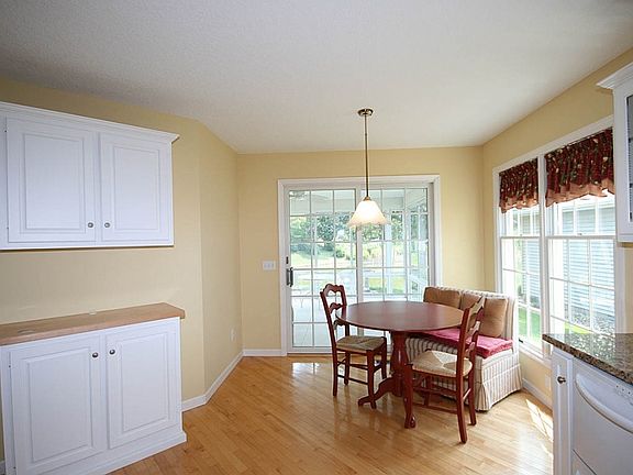 This beautifully appointed home has a brand new roof, new kitchen cabinets and granite counter-tops. It features 3 bedrooms, 2 baths, 2 car garage, three season room and overlooks a stocked, private pond. This is easy living at its best with the homeowners association taking care of pond treatment, lawn mowing, shrub trimming twice yearly, and snow removal. Expansive master bedroom with its own bath that features double sinks and walk-in shower. Third bedroom has custom built-ins so it could easily be a study or music room. There's plenty of storage with generous closets, and garage shelving. You can access the three season room from dining area or eat-in kitchen with its peaceful pond views. Fresh paint in pleasing colors, gas fireplace, and situated on a quit cul-de-sac, this home is ready for you.