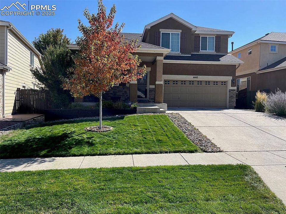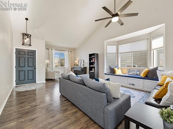 This beautifully maintained home is now available! Located near the vibrant Powers Blvd shopping and entertainment corridor, this property offers the perfect balance of convenience and stunning views of Pikes Peak. The home features a durable stucco exterior and boasts 3 spacious bedrooms, 3 bathrooms, and a 2-car garage. Step inside and be greeted by soaring vaulted ceilings and elegant laminate wood-look flooring throughout the main level. The Living Room offers a charming bay window with a built-in window seat that provides convenient storage. Adjacent to this is the cozy Family Room, which features a gas fireplace with a striking stone surround and a handsome wood mantle, creating the ideal spot to relax. The Gourmet Kitchen has been fully upgraded to meet the needs of even the most discerning chef. It includes sleek granite countertops, a subway tile backsplash, a spacious single-basin sink, a large island, and a pantry for extra storage. High-end stainless steel appliances complete the space, including a gas range, double ovens, microwave, dishwasher, and fridge. Just off the Kitchen is a generously sized Laundry Room, complete with additional storage space for all your needs. Upstairs, you’ll find an open Loft area that offers panoramic views of Pikes Peak, along with two well-sized bedrooms that share a full bathroom. The private Primary Suite is a true retreat, featuring an expansive en-suite with double vanities, a soaking tub, a separate glass-encased shower, and beautiful tile flooring. The oversized walk-in closet is fully customized with built-in shelving, providing ample space for all your wardrobe essentials. The Deck is ready to BBQ with a gas stub! Enjoy the serene fenced backyard, which includes a cozy patio space perfect for a fire pit, a convenient storage shed, and a gravel area ideal for a trampoline. The Unfinished Basement offers endless potential and is ready to be transformed into additional living space, tailored to suit your lifestyle.