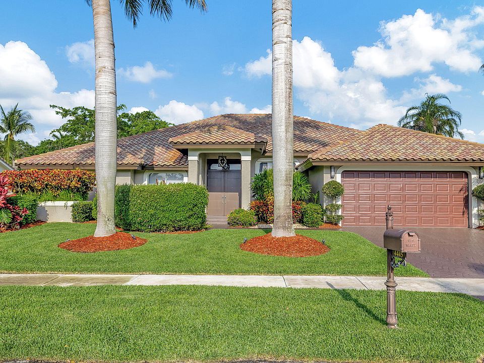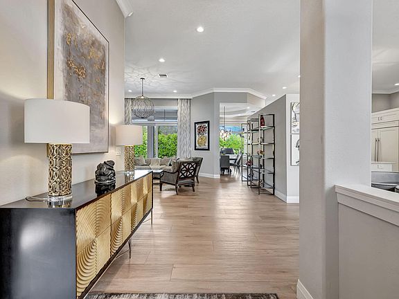 Sophisticated elegance awaits you in the pristine and serene development of Colonnade, perfectly situated in the heart of Boca Raton. This sprawling 5 bedroom, 3.5 bath split floor plan home with 2975 Sq FT is lavishly renovated with porcelain floors, an opulent chef's dream kitchen with Cristallo Premium Natural quartzite counter tops, solid oak self-closing cabinets, top of the line Jenn-Air appliances, and a chic backsplash gives the most visual appeal. The backyard is a relaxing paradise with new pool, porcelain tile, motorized screens, new landscaping, and a putting green for a outdoor entertaining. The primary bedroom is spacious with two walk-in closets and large primary bath with separate shower and spa tub with gorgeous solid oak cabinets. The stylish office has built in desk made of Liverpool Gray Leather Marble and ample shelves along with a closet and powder bath. The same Marble material is finished in the laundry room.