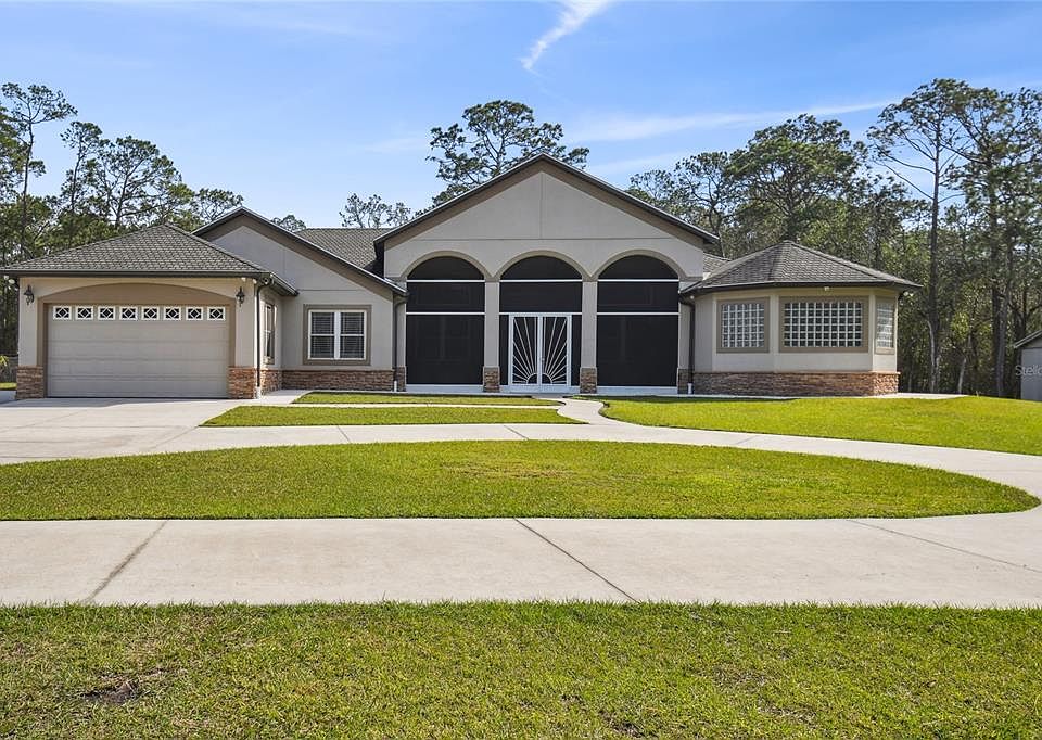 Indulge in a sanctuary of spacious luxury and discreet tranquility with this custom-built single-story residence, a masterful composition of four bedrooms and four baths sprawled across an expansive 4.92-acre estate. Impeccably maintained and poised for immediate occupancy, the home unveils an open floor plan that seamlessly connects living spaces, offering a harmonious flow throughout. The grand entrance foyer sets the stage, leading to a voluminous living room, a fortified panic room with formidable concrete walls, an elegant office space, and the regal master suite. Within the master enclave, tray ceilings preside over custom cement floors, an indulgent walkthrough shower, and two walk-in closets. Meanwhile, two bedrooms share the convenience of a Jack-N-Jill bathroom, while the fourth enjoys a private ensuite with a walk-in closet. The heart of this residence beats within its stunning kitchen, a culinary masterpiece adorned with stainless steel appliances, granite countertops, a walk-in pantry, and an induction cooktop. The kitchen seamlessly transitions into the welcoming family room, creating a space where both the home chef and guests can relish in the art of entertaining. Step outside to the inviting pool area, complete with an outdoor cook space and a sprawling 33x72 screen room, covered dining area, and built-in tiki torches provide an idyllic setting for cherished moments with friends and family. Notable interior features: Kitchen - walk-in pantry, extra large island, multiple seating areas; Primary bedroom - two walk-in closets, tray ceiling, walkthrough shower, large garden tub; In-law bedroom - walk-in closet, ensuite; Guest bedrooms - Jack-N-Jill bathroom; Laundry Room - cabinets, sink, exterior entry leading to the pool; Garage - epoxy floor. Additional interior notables: full pool bathroom, impact windows, crown molding throughout, plantation shutters, 10' ceilings, panic room, entire house vacuum system, entire house dehumidifying system, recess lights throughout, two water heaters (one for primary bedroom), 3 pane windows. Notable exterior features: 4 car carport, 213 sq ft enclosed front porch, over 3,000 sq ft back patio pool enclosure with covered area, 1 yr old on ground solar panels with 25 yr warranty paid off, entire house backup generator, roof 2008, 2 water heaters (1 is 2 yrs old the other is 8 yrs old), AC is from 2008, septic, well, 2 fish ponds with fountain filtration one with deck, cameras, flood lights, 1,400 sq/ft workshop, 200 sq ft polebarn, pump house. Culminate to define this property as an exquisite blend of opulence, functionality, and privacy – a haven to be appreciated. Schedule your private viewing today and immerse yourself in the allure of this distinguished residence. ****VIDEO WALKTHROUGH >>> https://realestate.febreframeworks.com/videos/bd4865a7-ea13-4338-8333-3025e5ff9d07 ****