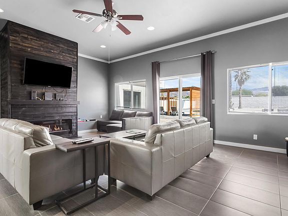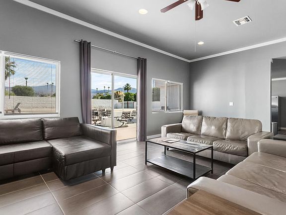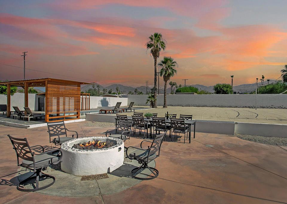 Nestled in the heart of Palm Desert, this exquisitely remodeled resort home, completed in 2015, offers a comfortable and stylish living experience. The private backyard features a large patio area next to a pool and spa, surrounded by a spacious deck with a gas fire pit. Enjoy a full-size beach volleyball court, stunning mountain views, an outdoor gas fireplace, and a built-in outdoor bar--perfect for gatherings. Inside, the kitchen is equipped with modern stainless steel appliances, quartz countertops, and a six-burner gas range. The main house includes 3 bedrooms and 3 bathrooms, while the attached casita offers two additional bedrooms and one bathroom, providing plenty of space for guests. The garage has been converted into extra living space, adding to the home's functionality. Situated on an oversized lot, the property allows for the potential addition of a guest house or income property. Offered furnished per the inventory list. This home is just a short drive from the world-class shops, art galleries, restaurants, coffee shops, and entertainment of El Paseo. It's an ideal choice for anyone seeking a blend of convenience and comfort.