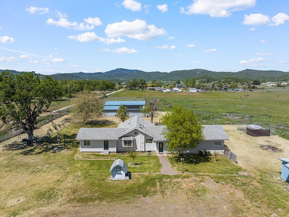 Horse property with 11 acres. The home has 4 bedrooms, 2 baths, living room, family room, coffered ceilings, skylights and hardwood floors. Pasture is fenced and cross fenced. The 1,735 sq.ft. detached garage has 2 bays, workshop and an office. The pole barn is 2,160 sq.ft. with a tack room and stalls. A new HVAC system and ductwork were installed on 9/22/23.