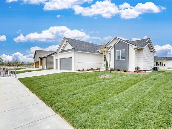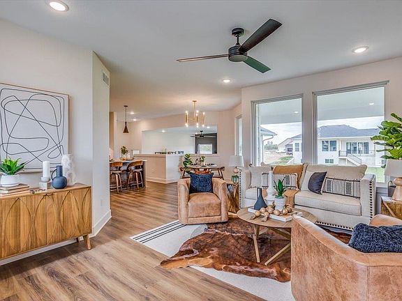 MODEL IS NOW FOR SALE! Lots of windows in this angled 5BR 3B FLEX home! Dramatic double door entry to secluded primary suite all in one wing of home. Entry from garage to house leads to kitchen w laundry/drop zone & pantry on either side. Large patio just off main level family room w fireplace. taxes shown on vacant lot only. Information deemed reliable but not guaranteed and may change without notice. Room sizes estimated. Specials may not be entirely spread yet on this lot There is a $250 mailbox fee collected at closing. Seller is licensed realtor in state of Kansas
