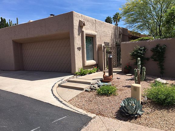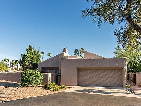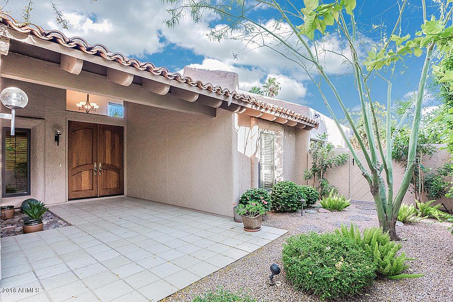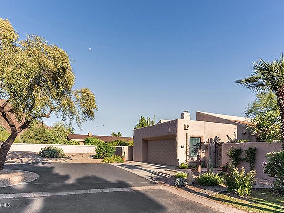 A home like this rarely comes on the market in this amenity filled Village at Camelback Mountain! Camelback Mountain views from the spacious back yard with pergola covered patios. Quiet, secluded lot provides unparalleled privacy and views with sprawling patios and decorator landscaping. Generous living room with vaulted ceilings and wood burning fireplace. The charming kitchen that opens onto an inviting family room space. Fantastic master suite with sitting area, large master bath and walk in closet. The whole community is being repainted this spring and this home is scheduled for late April. Two community pools and tennis courts. The best guard gate in Arcadia with friendly, helpful officers. Walk to Village Health Club, Steak 44, and AJs. Hurry!