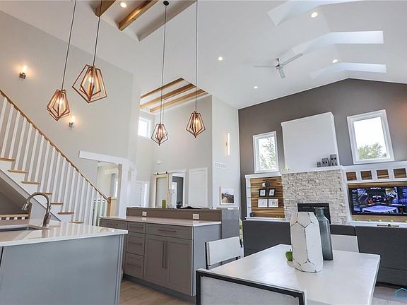 AWARD WINNING PARADE OF HOMES HOME w/2 story great room and kitchen. Great room and sunroom feature gas fireplaces w/ 2 islands & hidden pantry in kitchen. Full finished lower level w/walk out, bed, bath, theater, kitchen & wine room. Bonus room, stamped concrete patio w/fire pit,custom lockers & 3.5 car garage. Home features premium quality studs, osb subfloor & 1/2" closed cell spray foam.