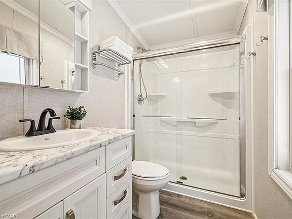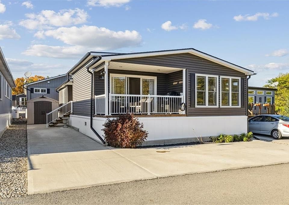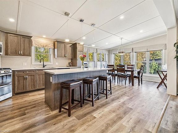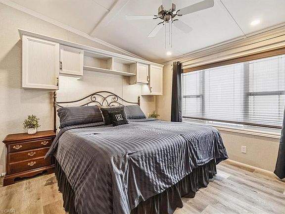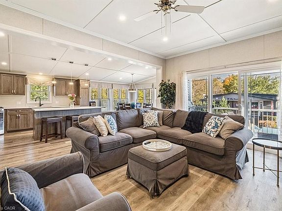 Welcome to this exceptional modular home, perfectly situated on leased land within the exclusive gated community of Lost Forest in north Burlington. Offering year-round comfort and a resort-like lifestyle, residents enjoy interior luxury and fantastic site amenities, including a seasonal pool. Step into the charming foyer and into an open-concept, single-level design, featuring soaring ceilings, and offering one of the largest spaces at 1315 Sq ft. The great room is bright and spacious with triple doors leading out to a cozy covered porch. The sunshine dinette features corner windows with eight large panels of glass. Some many things to appreciate including an upgraded kitchen with crown molding and large island, luxury vinyl floors front back, built-in wall cabinets in the great room, and bedrooms, offering tons of storage, in suite laundry and parking for three cars on the concrete driveway. Come and enjoy everything this worry-free, unique lifestyle has to offer!