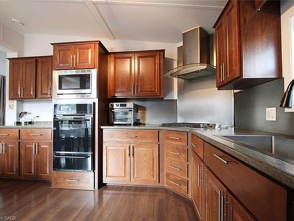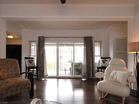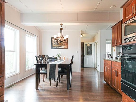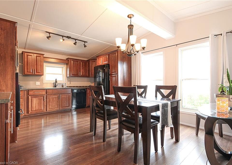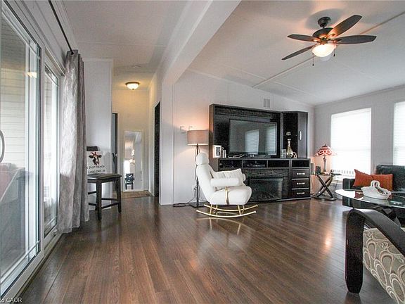 Welcome to Lost Forest! Discover a low-maintenance lifestyle in this stunning custom designed 2 bedroom, 2-bath modular home with cathedral ceilings and stunning family sized kitchen with warm decor and a flowing layout. Located in the desirable gated community of Lost Forest Park and built just 12 years ago, it offers 1,046 sq. ft. of bright, open-concept living space. This home combines modern comfort with a welcoming design in a gorgeous setting that far exceeds other types of ownership at an affordable price. The spacious kitchen features plenty of cabinetry including pull out drawers in the pantry, a large dining area and opening to a cozy living room complete with an entertainment wall unit with electric fireplace. Enjoy your morning coffee or relax at sunset on the large deck with 3 access doors to the your home including sliding doors that lets the natural light brighten your home. There is ample storage within plus a handy oversized garden shed to utilize as well. Additional highlights include a built in desk in the 2nd br, tall toilets, solid wood doors, a generator and parking for 2 vehicles on a concrete pad. Lost Forest Park residents enjoy outstanding amenities including an inground pool, community centre/pavilion, pickle ball court, an area to enjoy horse shoes, a play area for the kids and walking trails. The low monthly fee conveniently covers the land lease, water, septic, property taxes and year-round maintenance. Located just minutes from shopping in Waterdown and nearby Carlisle, dining, golf courses and major highways. This is the perfect blend of comfort, convenience, and community. Make the move today and start living the lifestyle you deserve!