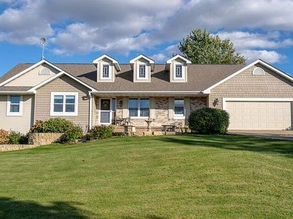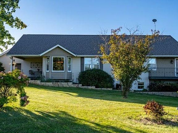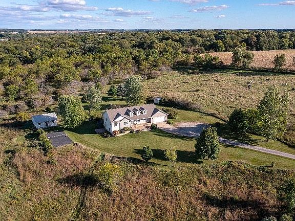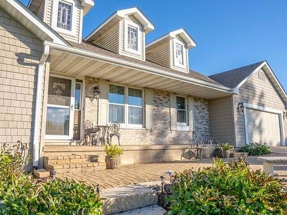 A MUST SEE! This 4 bedroom/3 bath beauty sits high on 5 rolling acres with country views for miles. Unique additions to this home, which was built in 1997, include gorgeous antique cast iron stair rails and a banister from a Masonic temple in Milwaukee, restored, antique, leaded glass windows from England, a stunning fireplace mantle and surround from Chicago. Exterior features include brick paved patios and walkways, limestone block landscaping, apple and pear trees, and an English-style garden with a gazebo brimming with climbing wisteria. A pickle ball court sits adjacent to the outbuilding which has an adorable sitting area. Upon entering the home, guests will be greeted with an open floor plan, vaulted ceilings, hardwood floors. The homes numerous, large windows are perfect for watching deer in your back yard, and the covered porch is perfect for enjoying your morning coffee. The kitchen boasts high quality, Kitchenaid SS appliances, granite countertops and plenty of cabinets. The master bathroom features a walk-in shower, and a tub. The bedroom itself has vaulted ceilings, a stunning crystal chandelier, and features access to a small deck. The fully finished walk-out lower, level is a wonderful entertainment space and includes a media room, solid oak bar, gaming area, and a full bathroom and additional bedroom for guests. This is someone’s dream home. Come see for yourself!