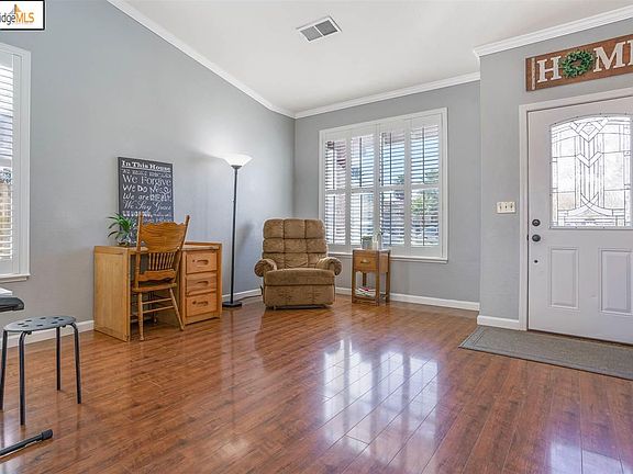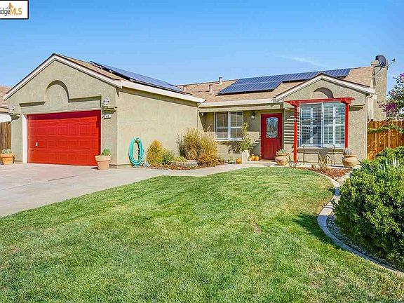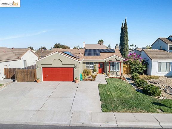 Vintage Pkwy., Single Story Beauty. Exterior offers a beautiful inserted glass door, updated paint, new roof, owned solar panels, censored exterior lighting, well-maintained front yard, and 9ft. side yard access. Home is less than 1.5 miles from Big Break Marina, which offers kayaking, paddle boarding, fishing, Delta Discovery with educational exhibits, trails, and more! Interior offers laminate flooring, crown molding, updated kitchen with 4x12 subway tile backsplash, milky way granite counters, black 7.5 in. handles on white cabinets, and lower pull out shelving. Stainless steel appliances and the kitchen sink, with low flow faucet. Brick wood-burning fireplace, open concept living/kitchen floorplan. Updated bathrooms offer distressed cabinets with Cortez countertops. The Master bathroom offers full shower glass doors with a beautifully tiled shower, tile flooring, wainscoting, framed mirrors, and new low flow toilet, faucets and so much more. Don't miss out, schedule your appt.