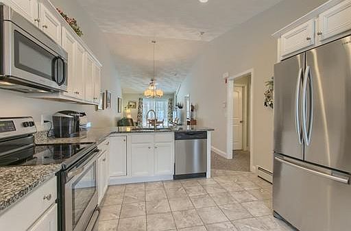 Looking for single level living? This desirable END UNIT condo built in 2015 features an open concept floor plan all on one level! Enjoy the spacious kitchen featuring white cabinets, glistening granite countertops, and stainless steel appliances with a breakfast bar! Dining/living area boasts cathedral ceilings and slider to wooded backyard patio area great for entertaining. First floor master bedroom with master bathroom with walk in shower and walk in closet! Guest bedroom and bathroom. Utility room with laundry in unit! Common room with meeting area and exercise room. Condo fee includes master insurance (interior & exterior), 8x4 storage space, landscaping, snow removal, trash, and water/sewer bill. Pet friendly â max of 1 pet allowed (up to 35 lbs). Great commuter location close to 495. Don't wait... get used to the maintenance free lifestyle of condo living today!