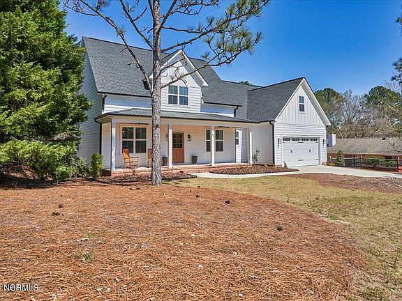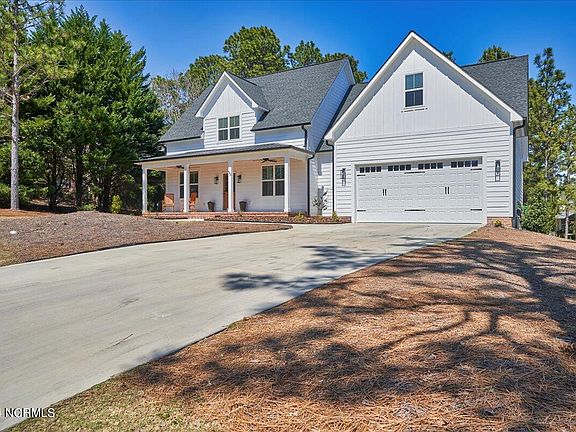 This beautiful contemporary farmhouse with 4 bedrooms, 3.5 baths, and two-car garage has close to 3000 sqft. The open concept floor plan features include: vaulted ceilings, natural wood ceilings in the porches, and interior trim details that are sure to impress. With the primary bedroom on the main level and guest suite on the upper level in addition to two bedrooms and a bonus room, space is not an issue. This home also features durable Luxury Vinyl Plank flooring for a water and scratch resistant finish, stainless steel appliances with a gas stove, carefully appointed lighting, granite counters, formal dining room, den/office with built-ins on the main level, a loft overlooking the living room and an L-shaped kitchen with an island. Built in 2022, this home rivals new construction homes with its attention to detail and convenient location in beautiful Pinehurst. Best of all, this home has a VA assumable mortgage at 5.125%.