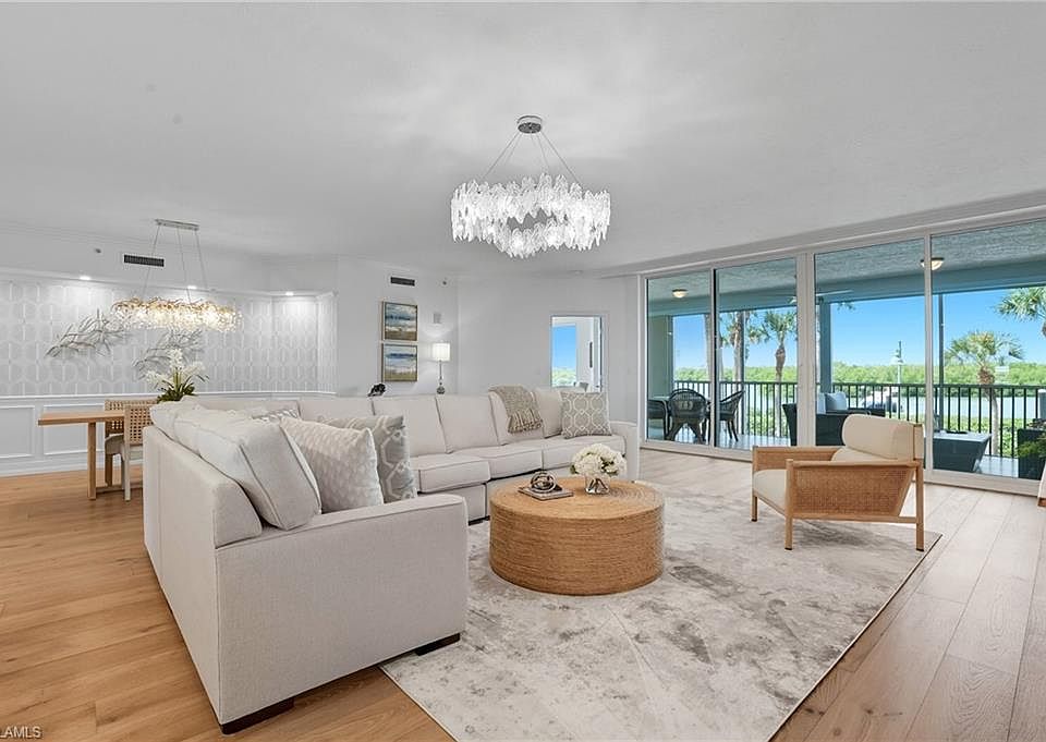 Discover the beauty of coastal living in this elegant residence located in the exclusive waterfront community of Pelican Isle. Spanning 2,677 square feet, this spacious condominium has been beautifully remastered, now offering an open and inviting floor plan designed for comfort and style. The large great room provides the perfect space for entertaining, with expansive west-facing views that fill the home with natural light and frame spectacular sunsets over the water. The private owner’s suite is a serene retreat, featuring a luxurious bath and direct access to the lanai, while two additional guest suites ensure comfort and privacy for visitors. Enjoy morning coffee or casual dining on the kitchen’s private veranda, surrounded by gentle breezes and tropical scenery. Built with peace of mind in mind, the residence includes top-quality hurricane impact windows and sliders, electric shutters on the lanai and veranda, and recent mechanical updates — including two newer air conditioning units and a new water heater. A spacious laundry room, ample storage, and assigned parking add everyday convenience. Set within a lush 15-acre island enclave, Pelican Isle offers an intimate setting with only three buildings and 136 total residences. Residents may also enjoy membership at the Pelican Isle Yacht Club, featuring boating access, beach shuttle service, dining, fitness, and vibrant social activities. Experience the best of Naples waterfront living — a refined blend of comfort, security, and coastal elegance — at Pelican Isle.