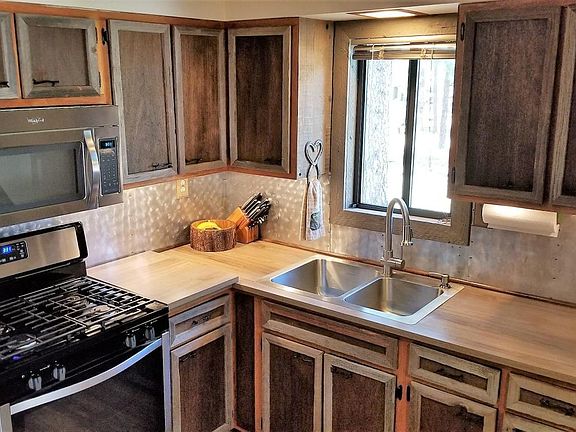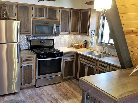 That perfect cabin in the woods has just been completely remodeled and is waiting for you! This 2 bedroom, 1 bathroom Pinewood cabin is perfect in every way. It has new laminate floors and carpet, new low-e windows, new doors, and appliances. If you like a rustic look, you will love the barnwood and steel walls and the sliding barn door that separates the laundry and storage area from the gorgeous kitchen. The kitchen has new countertops over wonderful cabinetry and stainless steel appliances. Up stairs is a bedroom and a loft area. Another bedroom and the bathroom are on the main floor. Step out onto the huge deck that is ringed with tall pine trees. There is lots of parking for this cabin and a big storage shed as well. This A-frame is bursting with energy and you will love it!