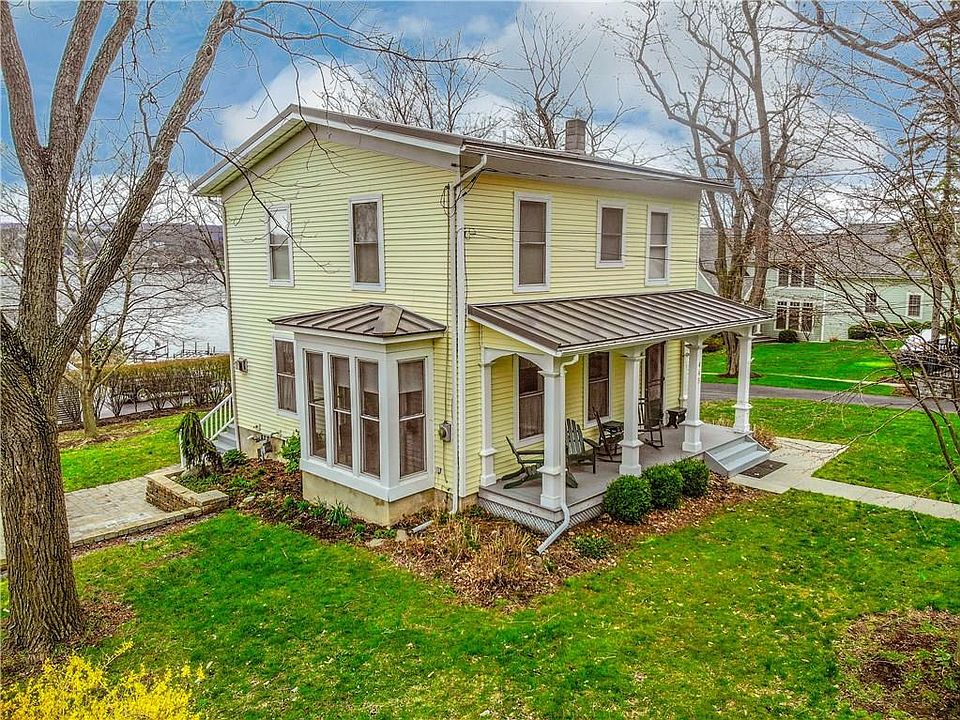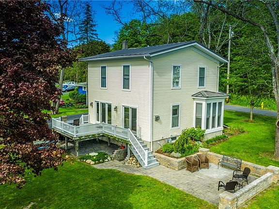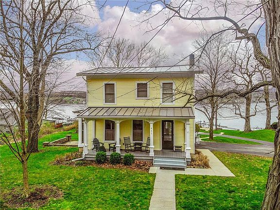 Classic and charming 1880 farmhouse cottage on spacious grassy lawn and 62' level lake frontage with decorative stone patio for entertaining! Open front porch, decking, blacktop driveway and parking! 3 bedrooms, 1 full bath and 2 1/2 baths-1st floor has washer & dryer! Free standing gas fireplace plus new radiant heat furnace for 1st floor! New metal roof! Open, light and bright living, dining, kitchen and front entry areas. Wood floors throughout! Dock and boat lift remain with property! Public water, sewer and nat gas! A Keuka Lake gem with no steps to the lake shore! Desirable lower East Lake Rd for walking and biking!