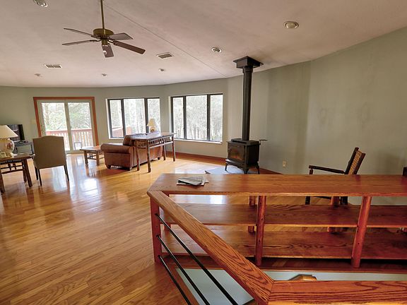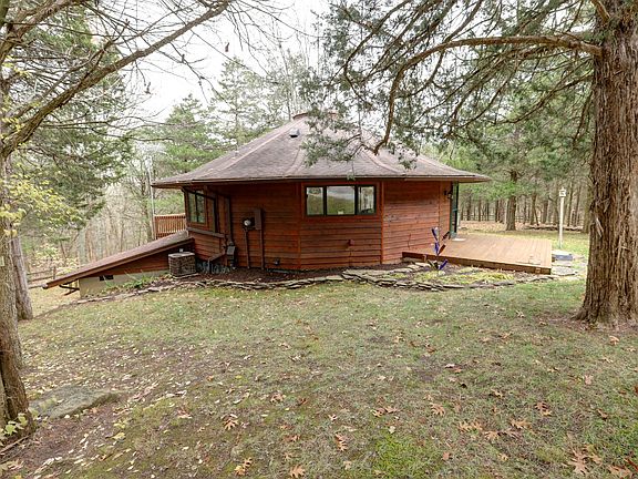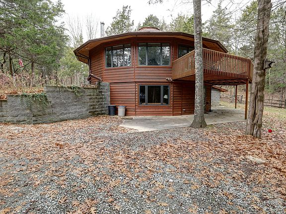 Nestled in five acres sits this unique Deltec custom home surrounded by woods and abundant wildlife. What a way to get away from the hustle and bustle of city life to peace and quiet of country living. It's round and unique structure is cedar-sided with a walk out deck from the primary bedroom and great room. It allows for some spectacular outdoor views. Features a walk out basement, covered patio, car port and storage units. Great room with hardwood floors feature a wood stove that helps keeps things energy efficient and cozy. Kitchen offers a breakfast bar with double oven and gas range. Plentiful storage in the basement in two separate rooms. Additional 5 acre adjoining lot available or can be sold in a bundle. Call for your private showing today.