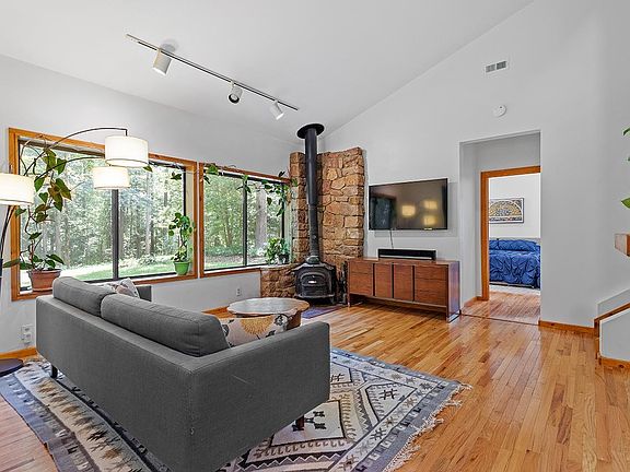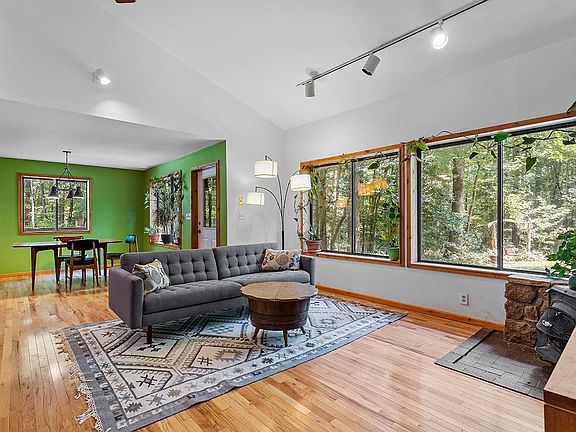 Beautifully remodeled 4 bedroom, 3 bath contemporary home on 6.2 acres with newly permitted master bedroom addition and passive solar. Newly renovated Kitchen with quartz counter-tops, stainless steel appliances and custom cabinetry. Enjoy the coffee bar/dry bar with built-in wine rack and Deacon's bench. Downstairs master suite with vaulted ceilings, sitting area and dual closets. Newly expanded master bathroom with ceramic tile, dual vanities, soaking tub and glass enclosed shower with waterfall head. Upstairs guest bedrooms with vaulted ceilings, full bath and sleeping loft. Hardwood flooring throughout main level. Wrap around deck and screened in porch provide ample outdoor space to relax and entertain. Detached studio with LVP flooring, Murphy Bed, and excellent lighting for potential in-law suite, yoga or ballet studio. The possibilities are endless here! Gigantic fenced garden with mature fig trees, persimmon and tons of berries. Floating garden-side deck perfect for grilling. The surrounding woodlands beautifully juxtapose this huge 6.24 acre yard. Truly a rare find!