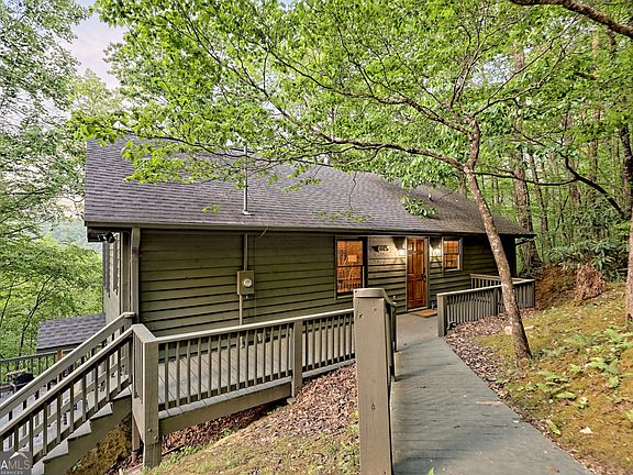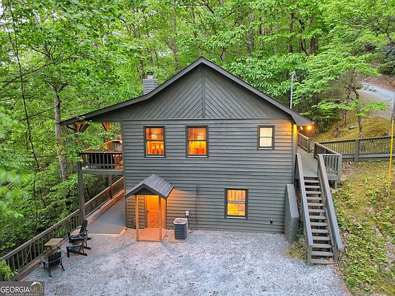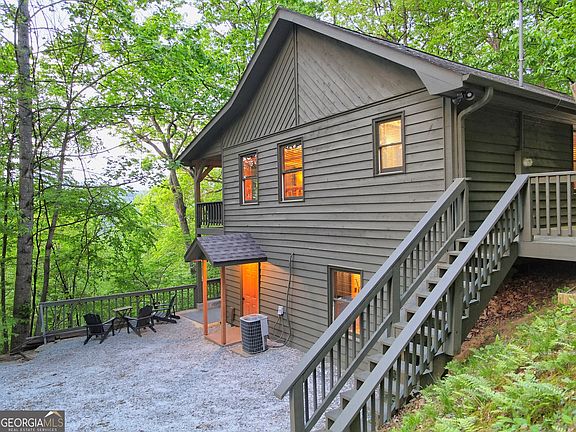This beautiful mountain home retreat is hidden high atop scenic Screamer Mountain; fully refurbished to reflect its natural setting, with modern, sophisticated finishes at every turn. The entire home has new wood laminate flooring throughout, as well as knotty pine wall planks. The main kitchen has been remodeled with new cabinetry, Quartz counters, a custom-built rustic dark oak island, and brand-new stainless-steel appliances. The cabinetry has also been added in the adjacent dining room for optimal storage of dishware. Nearby, the wooded great room has a stone fireplace and bone-color antler chandelier high above. As you head downstairs, you will find a remodeled wreck room (all furnishings and electronics are new and included), as well as a kitchenette/wet bar for entertaining galore. Discover a secret bedroom, hidden behind the kitchenette shelving! This bedroom has been creatively decorated as a charming camping-style room. The remaining three bedrooms are all wooded and beautifully decorated, two with dramatic king size beds. The primary bedroom has a large sliding glass door that provides incredible mountain views, as well as private vanity and bathroom. All three full bathrooms in the home have been remodeled with new vanities, toilets, fixtures, black matte hardware, and wooded tub sides. This mountain home has two large back porches, both with glorious views of the Georgian mountain landscape. An entire sauna room has been added to the home, right off the lower porch. With the quaint, yet vibrant town of Clayton just 5 minutes down the mountain, as well as wineries, galleries, hiking, rafting, and other activities nearby, this home is perfect as a year-round residence, a second home escape, or a vacation home rental. Discover a true original.