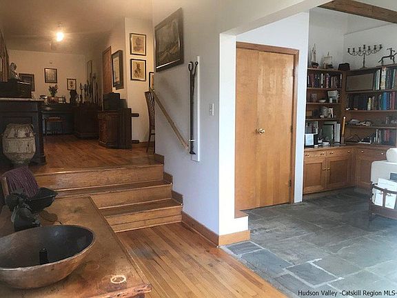 Come experience this 'One of a Kind', 'Sawtooth' styled contemporary home, gently nestled within over 11 acres of wonder and wildlife. This unique home has been lovingly designed and built by the current owner, with thoughtful additions added on through the years. Open floor plan is perfect for today's lifestyle! The central living area, boasts soaring beamed ceilings, radiant heated natural bluestone flooring, and custom built-ins. Wood stove rests on raised stone hearth with brick back drop, adding warmth to the center of this bright and inviting space. The galley kitchen is modest, but is supported by one of the largest walk-in pantries you'll ever see, a perfect home for all your kitchen supplies in addition to the washer-dryer. Master bedroom suite is massive, with two oversized walk in closets, wood burning brick fireplace, floor to ceiling windows, and full bath with 2 person Jacuzzi tub. Master is large enough to accommodate sitting area or exercise area with space for even more! Newest addition is the office/library/ main floor third bedroom, featuring a wall of shelves for all your collectables. Woodworking was done on site, creating custom cabinets and shelving; the wood was milled from oak trees which once grew on the property! Massive windows embrace the beauty that surrounds and drench the interior with light. South facing windows, designed as passive solar: in the winter the sunshine warms the living space and the two foot overhangs shade the windows in summer. The second floor bedroom is also finished with custom builtins. Oak floors run throughout the balance of the house. Mechanics of the house are maintained yearly, including boiler, chimney, back-up automatic generator and pest control. Whole house Culligan water system is owned, and reverse osmosis drinking water system is rented. Did I mention the 23' x 40' detached garage? This 2 story structure, has the garage below (could accommodate 3 carefully positioned autos) and upstairs is a workshop, heated and complete with a wall air conditioner and ground level deck! A line was run for easy access to water, making the possibilities endless for studio space or even possibly an accessory living space with town approval! Over 400' of beautiful stone walls run along Plutarch and throughout the property. All the stone was gathered from the property to create these works of art. The Black Creek runs at the end of the property, as some of the land is designated wetlands, hence forever wild, so what you see today is the same as it was 100 years ago. Watch beautiful sunrises from the comfort of your bedroom suite, or sipping your coffee overlooking your very own nature sanctuary! Just minutes from downtown New Paltz and the NYSThruway Exit 18. Poughkeepsie Metro-north train station and Walkway over the Hudson are less than 20 minutes away! Hiking, Biking on the local Rail Trails or in the thousands of acres of Preserve and State Park Lands just minutes away!! If your not looking for 'a cookie-cutter' home, don't miss this opportunity to make this house your HOME for 2019!