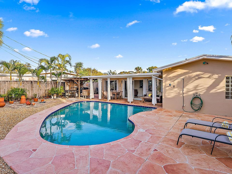 This 3 Bedroom/2 Bath + den remodeled home offers the ''BEST OF INDOOR-OUTDOOR LIVING''. The open floor plan offers great natural light + updated kitchen and baths. The french-style, kitchen is functional and beautiful w/ gas cooking, a breakfast bar, granite counters, stainless steel appliances, white shaker cabinetry, pretty display areas + a movable kitchen island for prep-work . The master suite is spacious w/bamboo floors, double closets + a large bath with separate toilet room, dual vanity cabinet + garden spa tub. Resort living outdoors begins w/ a huge patio, a free-form saltwater pool, fire pit, tiki bar + covered outdoor dining/entertaining areas. The beauty of night lighting transforms this home into a true Florida living experience!